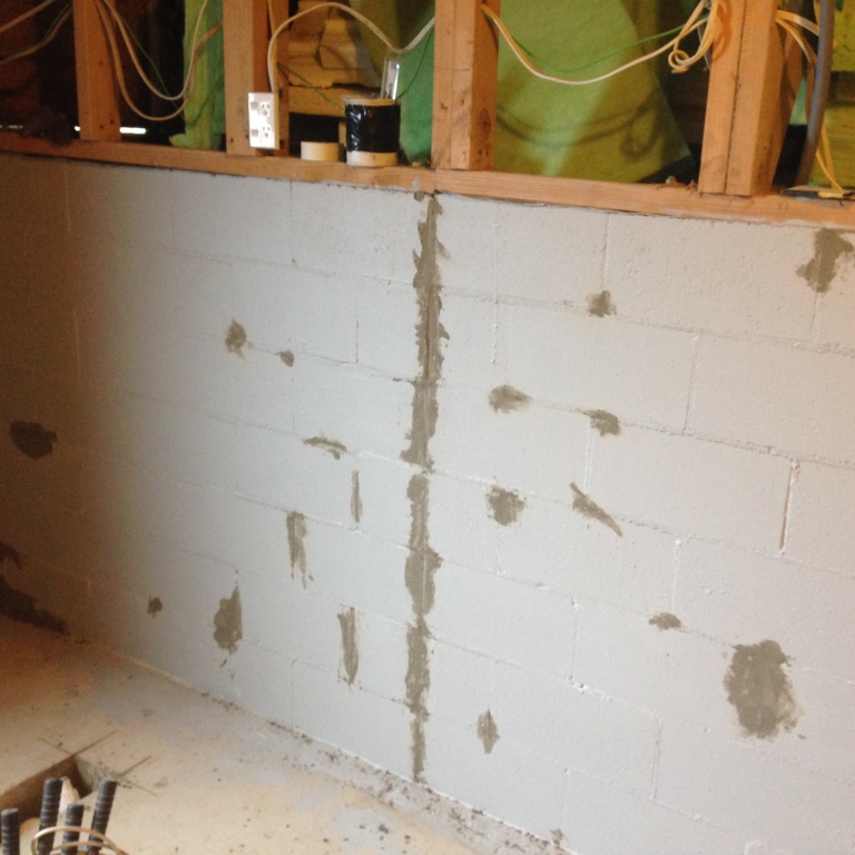 Step two was ensuring the watertightness of the previously built block wall. We'd noticed during our pre-purchase inspections that there was some efflorescence on some of the blocks. The dirt had been a bit over-filled behind the wall, drainage outside was pretty poor which was directing water towards the house, and the wall itself had some gaps in it which hadn't been properly filled. So there was a heap of digging to remove some of the dirt; we're looking at several improvements to outside drainage to divert water away from the house; and we filled all the gaps in the wall and have painted on a rubberised membrane which should prevent moisture from being able to seep through.